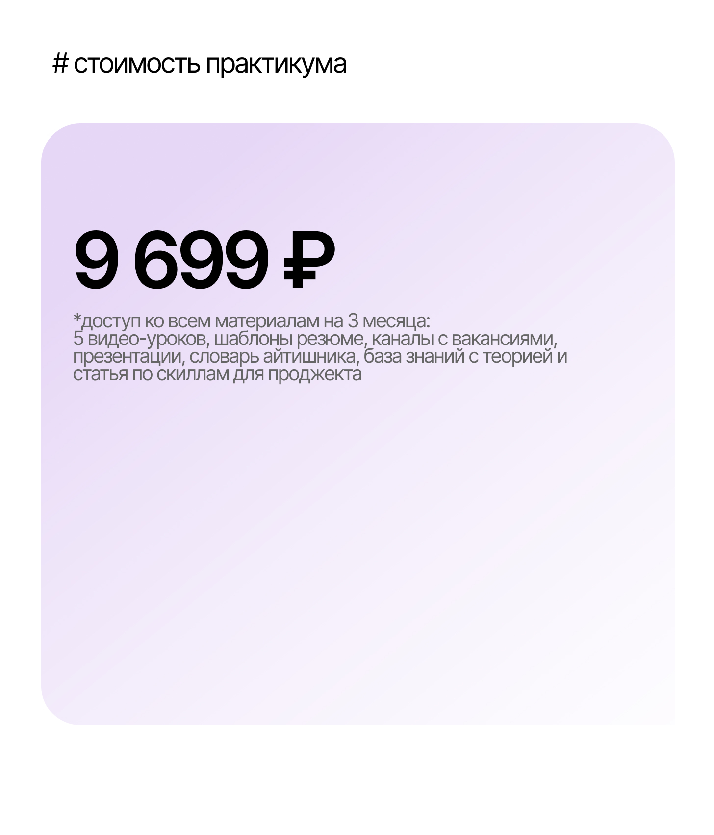 Курс подходит как опытным специалистам, так и начинающим. Эта программа для тебя, если ты хочешь войти в IT с нуля или же вырасти по карьере и доходам.